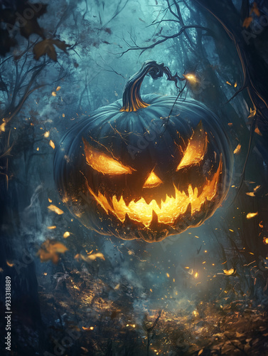 Naklejka premium Jack-O'-Lantern Floating in Dark Enchanted Forest