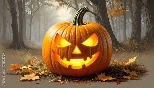 © Armaya, Obraz premium Jack-o'-lantern in misty forest
