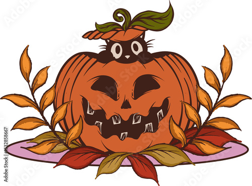 Obraz premium Jack-o'-lantern is revealing black cat, autumn leaves and pink oval, flat,...