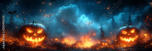 Fototapeta premium Jack-o'-lanterns glow ominously in a dark forest.