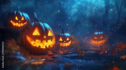 Naklejka premium Jack O' Lanterns Glowing In Fantasy Night. Halloween Background