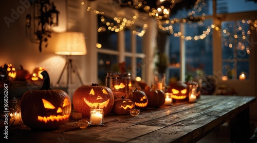 © redflower, Obraz premium Jack-o'-lanterns illuminating a rustic Halloween table setting