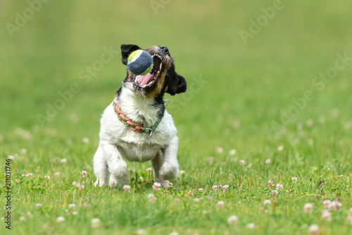 © Karoline Thalhofer, Fototapeta premium Jack Russell Terrier male. Active dog plays with his ball with power and energy
