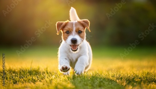 Obraz premium 芝生の上を走っているジャックラッセルテリアの子犬(Jack Russell Terrier puppy running on the grass)