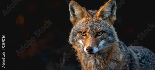 © Magiurg, Fototapeta premium Jackal with intense gaze. A close-up portrait of a jackal with a focused expression against a dark background. Perfect for wildlife photography or animal portraits. Photography, horizontal format.
