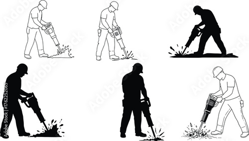 Obraz premium Jackhammer Operator Silhouette and Line Art Set Showing Construction Worker Breaking Ground with Debris and Safety Gear in Action