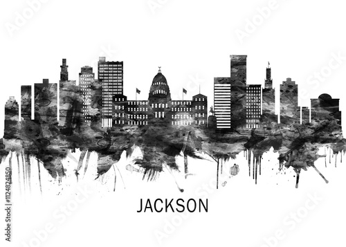 © Towseef Dar, Naklejka premium Jackson Mississippi skyline BW, city landscape banner district business print painting watercolor