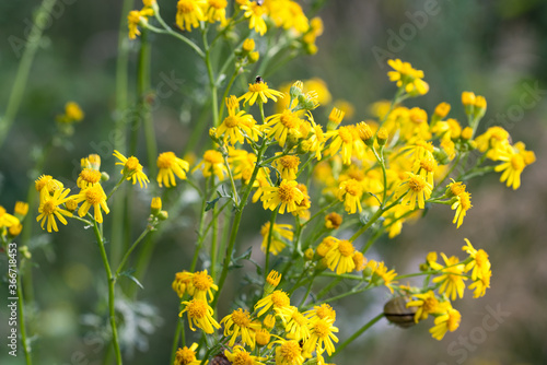 Obraz premium Jacobaea vulgaris, ragwort yellow flowers closeup selective focus