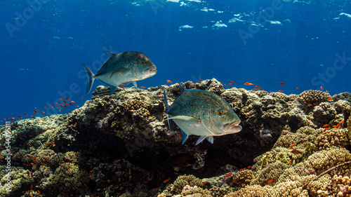 © Heiko Jetzkowitz, Fototapeta premium Jagende Makrelen in buntem Korallenriff vor blauem Hintergrund