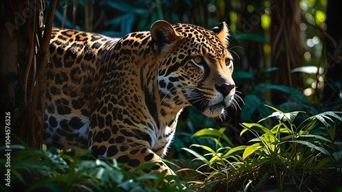 Obraz premium Jaguar, A Majestic Jaguar Stalking Through a Lush Jungle, Capturing the...