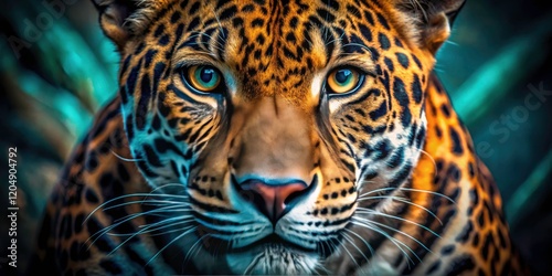 Obraz premium Jaguar Close Up, Long Exposure Photography, Dark Amber Cyan, Wildlife Portrait, Big Cat Face