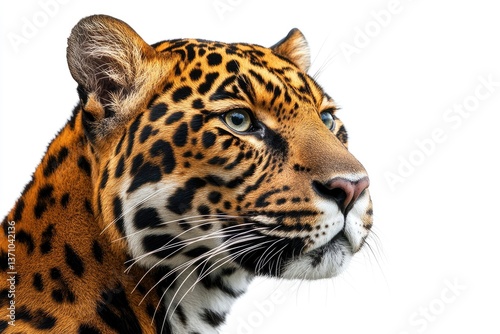 © AYESKIA, Obraz premium Jaguar Head Profile Portrait on White Background with Detailed Fur