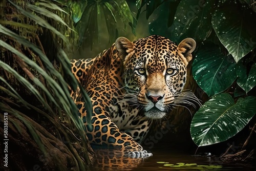 Obraz premium Jaguar in the jungle of the Amazon. Generative AI