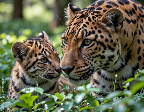 Fototapeta premium Jaguar mother and her cub sharing a tender moment in a lush green jungle