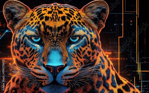 Obraz premium Jaguar portrait featuring vibrant colors and high contrast against a digital...