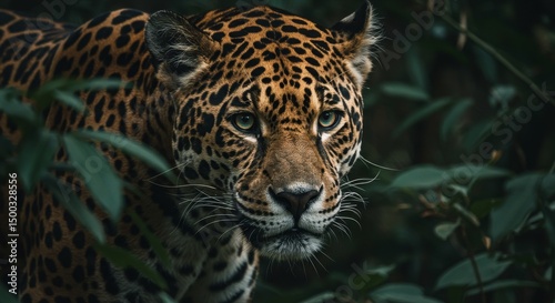 © Cahyani, Fototapeta premium Jaguar Portrait Photo in Jungle Green Leaves with Spotty Fur and Green Eyes