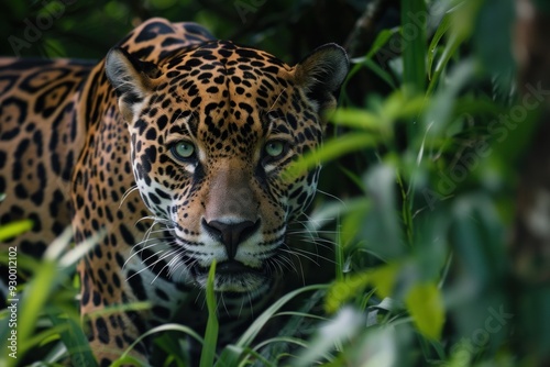 © Minerva Studio, Fototapeta premium Jaguar prowling through lush green vegetation in the jungle