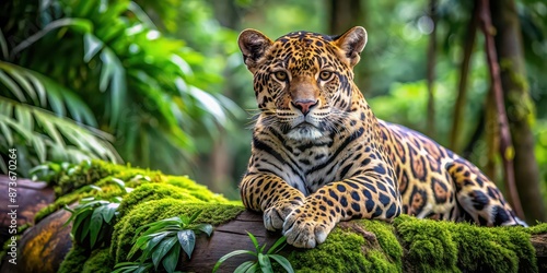 Fototapeta premium Jaguar resting on a rock, Leopard relaxing in the rainforest on a timber covered in moss and looking at the camera