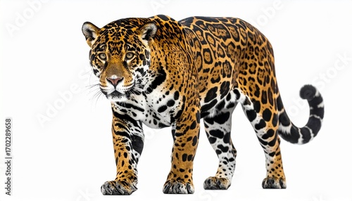 Fototapeta premium Jaguar with golden yellow fur black rosette spots muscular frame stealthy predator cat isolated on white background