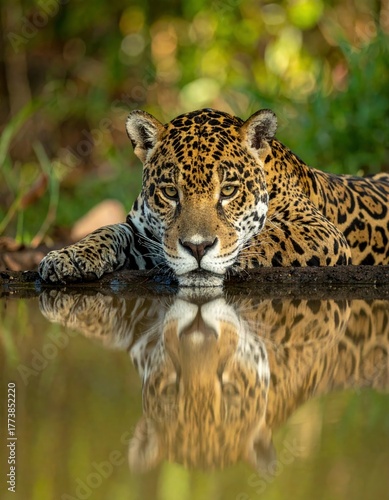 Obraz premium Jaguars Reflection - A Moment of Serenity in the Wild.