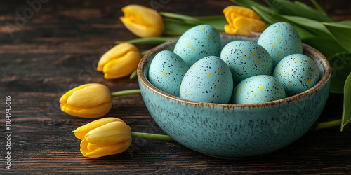 Naklejka premium Jajka w porcelanowej misce i tulipany - Kartka na Wielkanoc