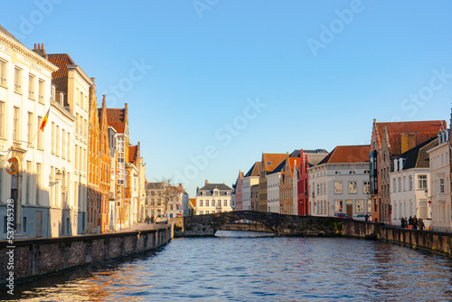Naklejka premium Jan Van Eyck Square , located along the canals of Academiestraat, Spiegelrei and Spanjaardstraat in Brugge during winter sunny day : Brugge , Belgium : November 30 , 2019