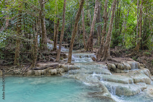 Naklejka premium Jangle landscape with flowing turquoise water of Erawan cascade waterfall
