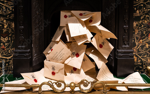 © MergeIdea, Obraz premium JAPAN - NOV 13, 2023: Hogwarts acceptance letter and envelope with vintage red wax seal overflow from fireplace at Warner Bros. Studio Tour Tokyo, The Making of Harry Potter, Wizarding World