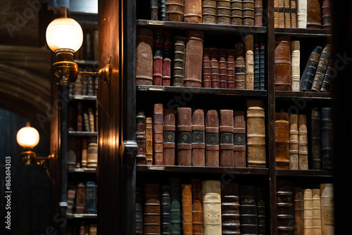 © MergeIdea, Fototapeta premium JAPAN - Nov 13, 2023: Hogwarts library with vintage bookshelves filled with old leather bound books illuminated by antique wall lamps at Warner Bros. Studio Tour Tokyo, The Making of Harry Potter