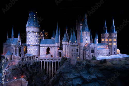 © MergeIdea, Naklejka premium JAPAN - Nov 13, 2023: Stunning night view of Hogwarts Castle, beautifully illuminated showcasing iconic towers and intricate architecture at Warner Bros. Studio Tour Tokyo, The Making of Harry Potter