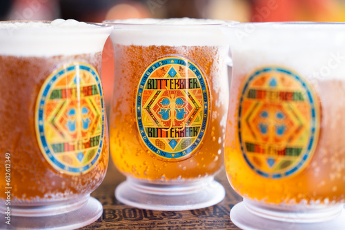 Fototapeta premium JAPAN - NOV 13, 2023: Three glass of BUTTERBEER alcohol free cold drink with white foam and close up honey bee logo on label in Warner Bros. Studio Tour Tokyo, The Making of Harry Potter