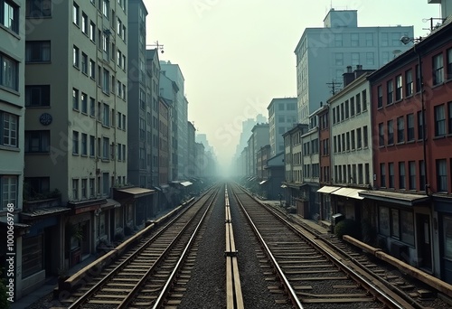Naklejka premium Japan's Urban Tapestry: Top-to-Bottom Photography of Classic Trains Intersecting Modern City Skylines and Residential Complexes