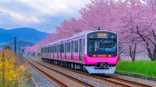 Naklejka premium Japan train in Yamakita Town, Kanagawa prefecture, under a sea of sakura...