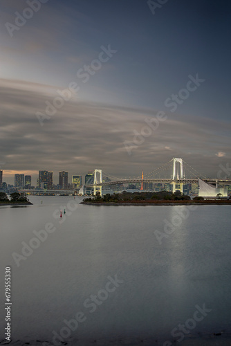 Naklejka premium Japan Travel Destinations. View of Rainbow Bridge in Odaiba Island in Tokyo At Twilight with Line of Skyscrapers
