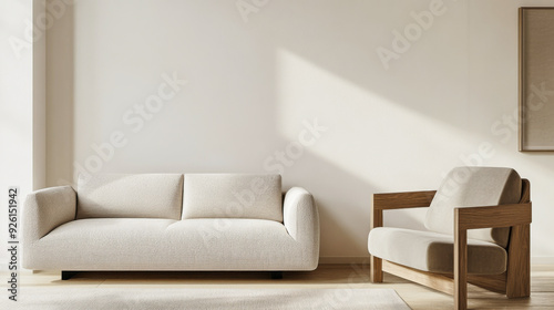 Obraz premium Japandi interior design composition with minimal furniture in beige colors....