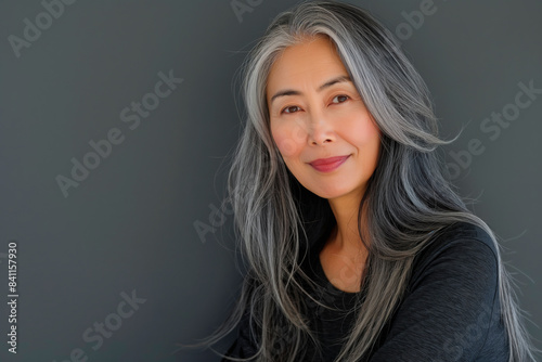 © MVProductions, Fototapeta premium Japanese adult woman with smooth healthy face skin. Beautiful aging mature asian woman with long gray hair and happy smiling touch face. Beauty and cosmetics skincare advertising concept.