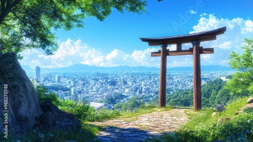 Obraz premium Japanese Anime Landscape with Scenic Mountains, Cherry Blossoms, and Sunset...