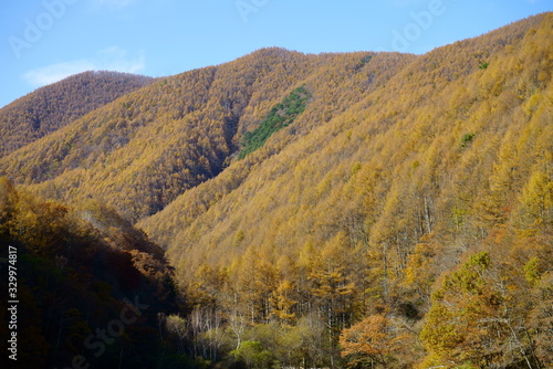 Naklejka premium Japanese autumn forest and dam lake