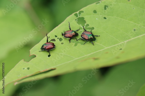 © Lisa Basile Ellwood, Fototapeta premium Japanese beetles on a leaf