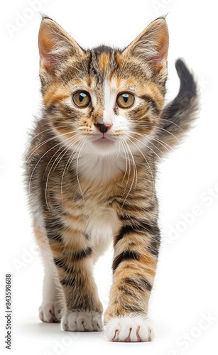 © hakule, Obraz premium Japanese Bobtail cat with a white face and black ears walks on a white background