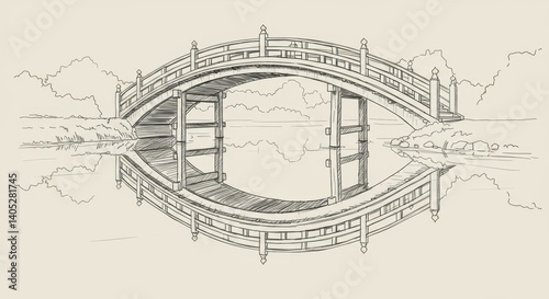 Obraz premium Japanese Bridge Drawing over Calm Water