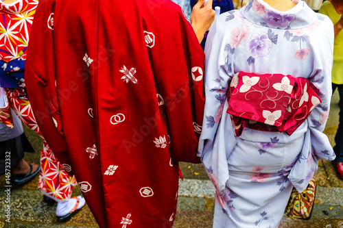 © themorningglory, Naklejka premium Japanese Couple's wearing traditional Kimono dress at Fushimi Inari Temple