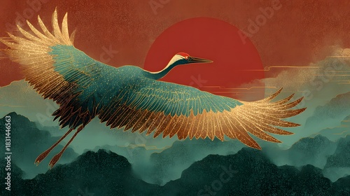 Naklejka premium Japanese Crane Flying Against Red Sun with Mountains and Textured Sky