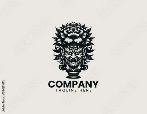 © Dawi Firdaus, Fototapeta premium Japanese demon mask vase with blooming peony flower black vector logo illustration