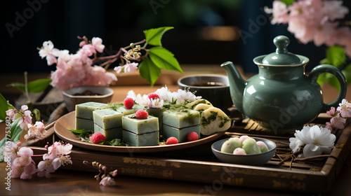 Naklejka premium Japanese dessert mochi with matcha green tea powder and cherry, japanese tea...