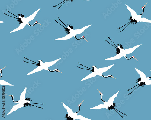 Fototapeta premium Japanese Flying Crane Bird Vector Seamless Pattern