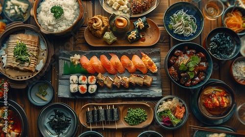 © WrongWay, Fototapeta premium Japanese food photographed from above in a flat lay style Copy space
