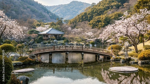 Fototapeta premium Japanese Garden Bridge with Cherry Blossoms