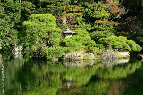 Fototapeta premium Japanese garden, pond and stone lantern. Kyoto Japan.