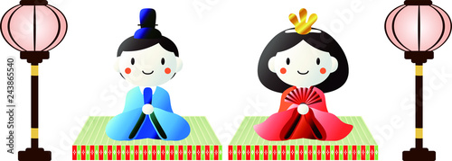 Fototapeta premium Japanese Gradation cute Hina dolls on tatami sheet with paper lantern